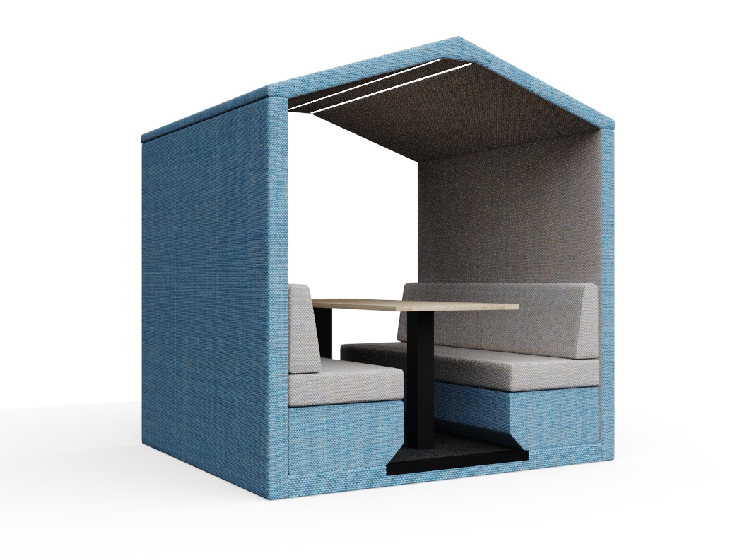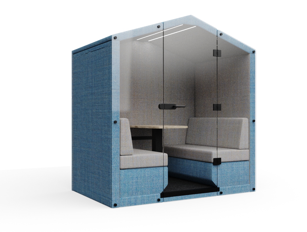 The Bea Collection Booth or Pod can be open or closed, and specified from 2, 4 and 6 persons with optional glass door wall, PIR lights, ventilation, and castors. This product also comes as standard with a central table.
