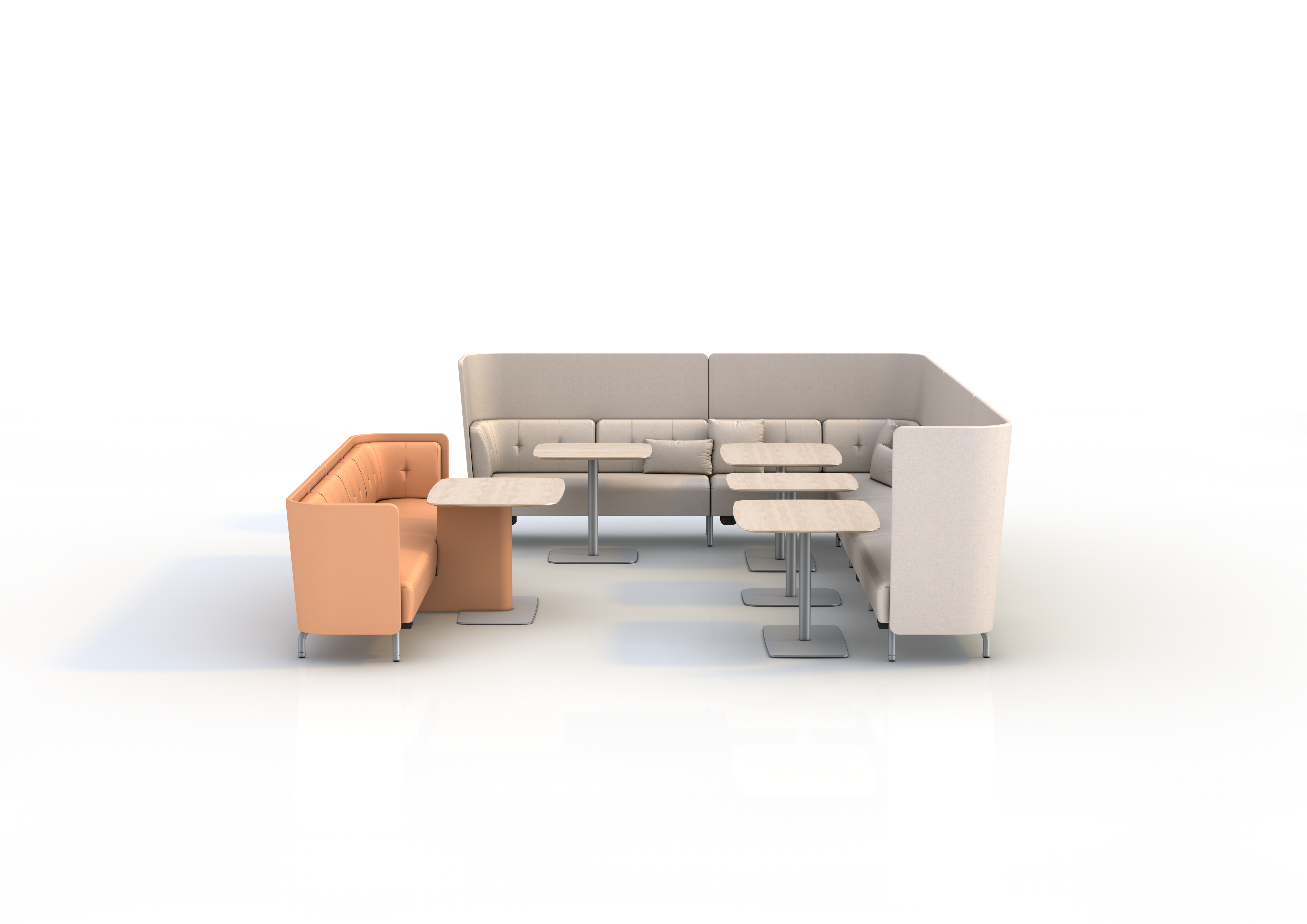 A modular upholstery system that offers a supportive, upright sit, in combination with ergonomic fixed worktables, Beyond the Desk is complemented by integrated worktop power. The upholstery’s design, colour and texture effectively divides up spaces, offering privacy for individuals, teams, and larger collaborative work groups. The modular design of the system also gives clients the flexibility to create both small sanctuaries and larger social hubs, all from the same sculptural collection.
