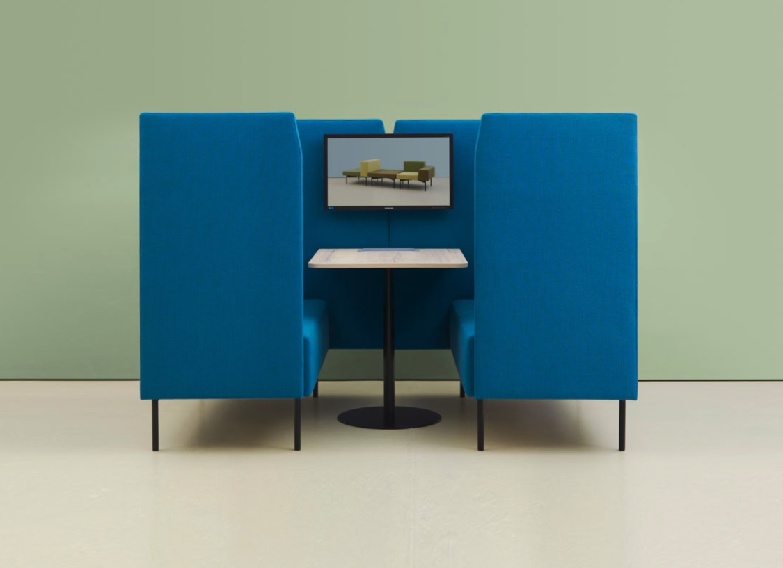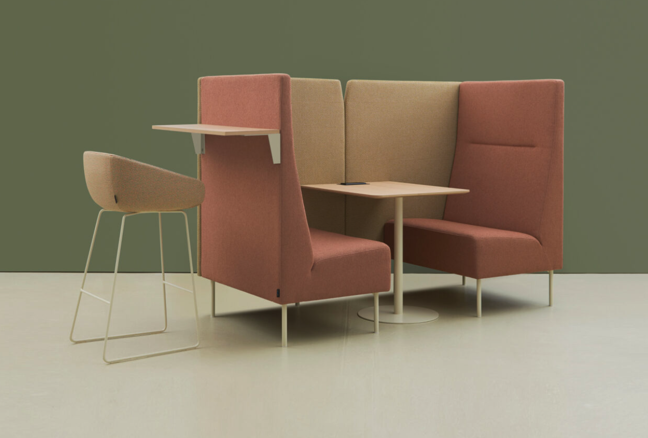 A modular booth and privacy seating system designed to meet the flexible needs of our working environments. hm19 Reveal provides sanctuary for private working as well as space for collaboration. The seating options are available in five seat widths with high or low back options and can be ordered as chairs and sofas with dual side panels, or configured into booth seating using the booth panels and tables. Corner and curved units allow modular wrap around banquette style meeting spaces. Individual desk booths complement the seating range, offering private touchdown work and study spaces. These can incorporate power units and display screens.