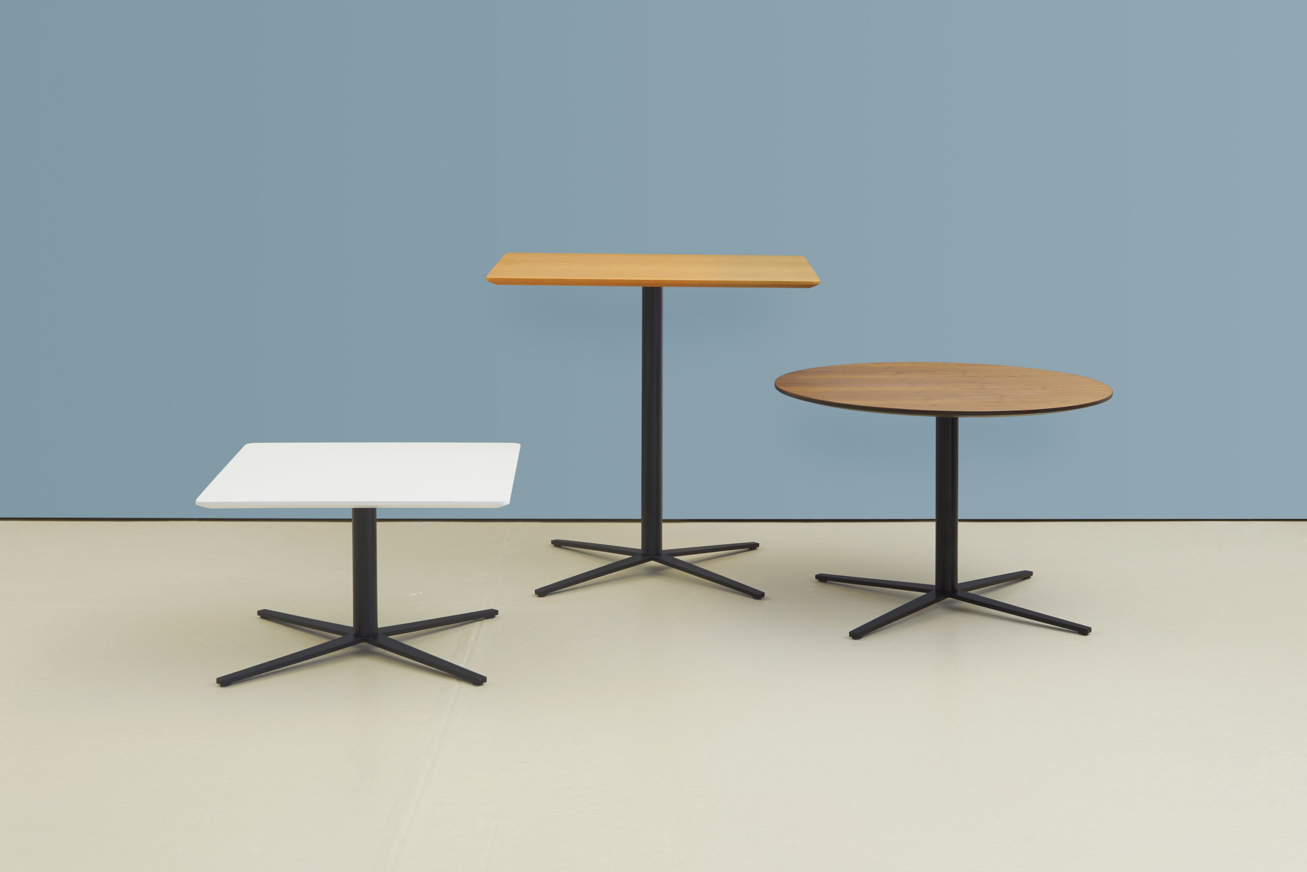 Axis tables are suited to meeting, dining and breakout spaces in four standard heights - 2 height options for side and coffee tables meeting/dining height bar height