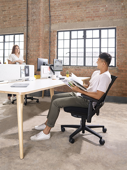 I-Workchair 2.0 with a newly developed compact synchro mechanism featuring integrated controls for;- seat height, seat depth, back lock, and tension adjustment. Providing pivot geometry that ensures a fluid ergonomic motion supporting the user fully during recline. • The synchro mechanism ensures the seat and backrest move in harmony with a ratio of 2.7:1 and a maximum back recline of 22 degrees from the action with a further 8 degrees possible from the pivoting back motion. • A multi-position back lock incorporating three preset lock positions fitted with an ‘anti-kick’ brake system.