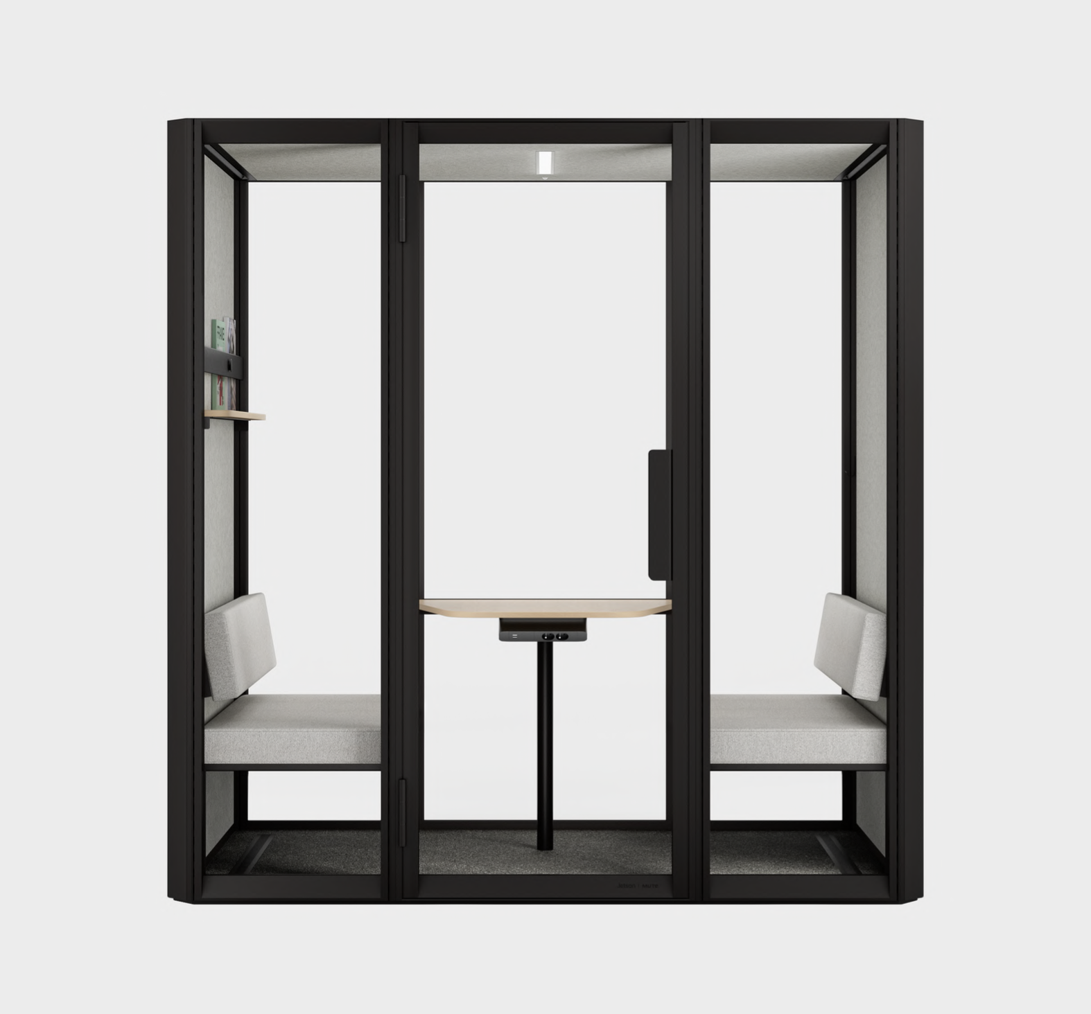 27dB aluminium frame and steel structure; hinged door; aluminium handle; MDF side table; tempered glass with anti-shatter film; motion sensor controlled LED light & air ventilation; 2 AC Outlet and dual-USB outlet (DC 5V 2.1A) and CAT6 RJ45 socket. Levelling feet.