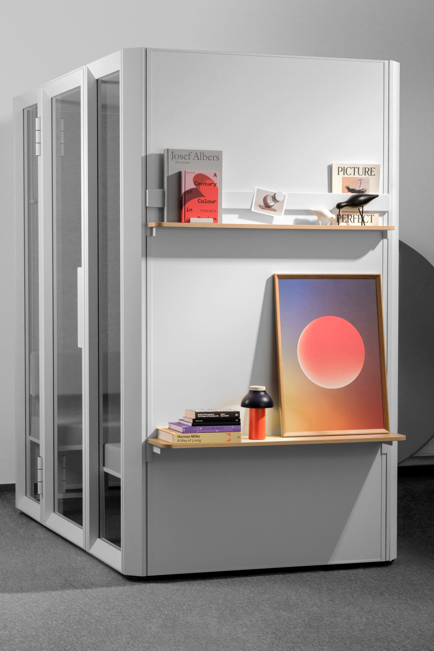 Exterior walls in Moon White or Void Black, interior walls and ceiling in Light Grey Felt, Tabletop and shelves in Oak Wood Melamine, seting upholstery in Gabriel Chili 60115. Dark Grey carpet