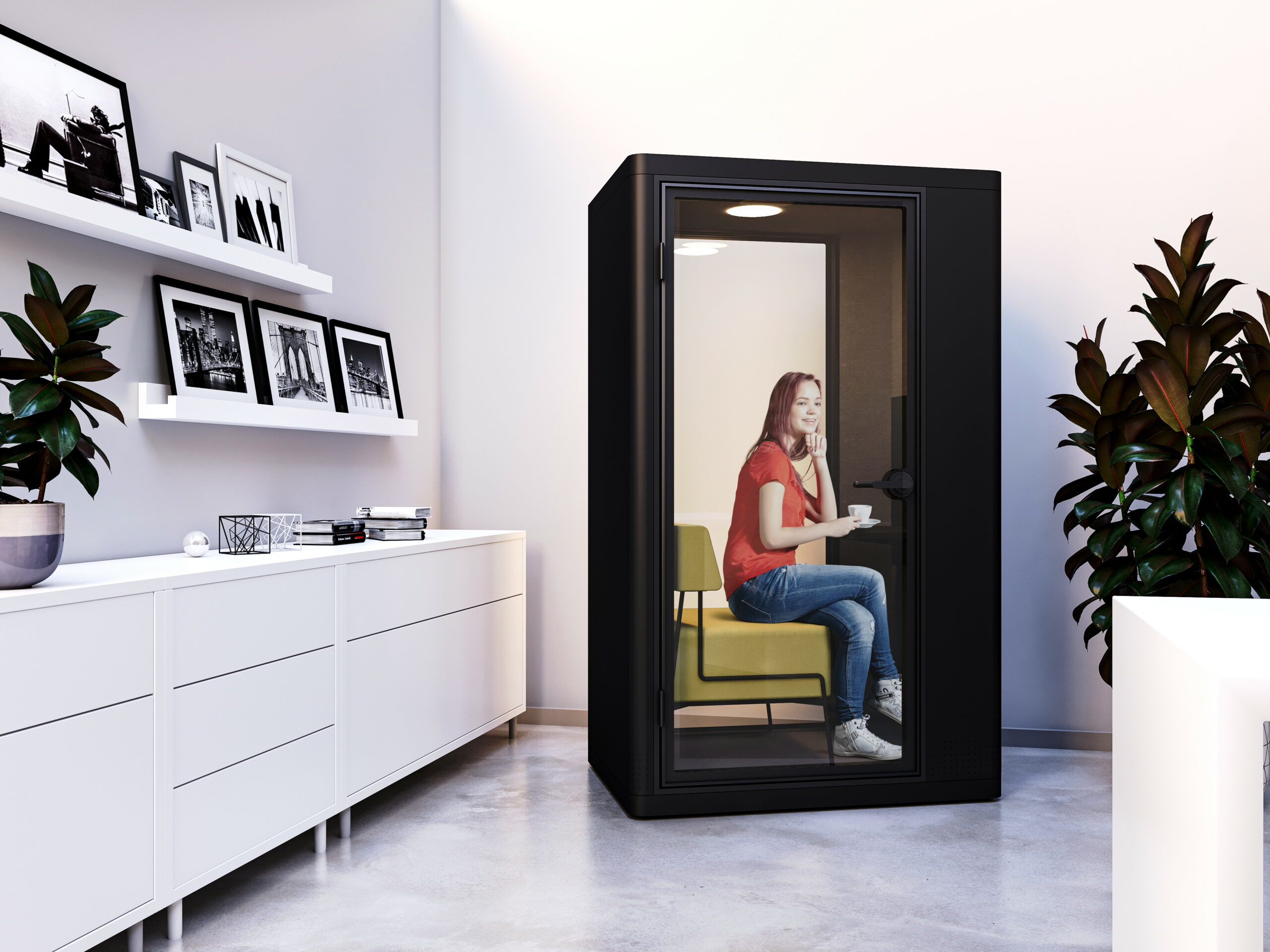 The 'Sit' variation of the Milli Pod is a purpose-built sitting acoustic booth for a quick in-and-out private conversation or a short exclusive personal session