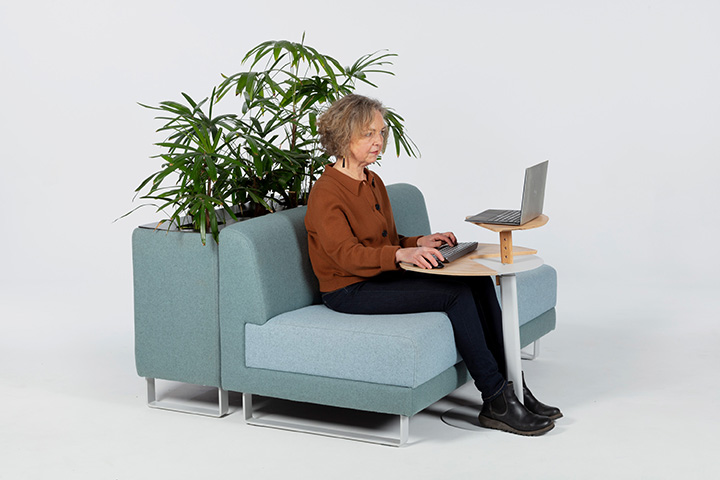 "Otto is a unique dual action laptop table designed to radically improve the posture of our increasingly agile workforce. Otto laptop table offers increased health benefits whether undertaking a short spell of intensive work between meetings or using a laptop to join online meetings. With a unique dual adjustment, it makes laptop use comfortable and viable even for longer periods on low-level seating. The laptop table can be easily set to the correct height for writing and typing. Meanwhile, the laptop can be elevated with the screen at eye level – perfect for making video calls. Otto is designed to suit many third-space settings such as breakout and collaboration spaces along with receptions, café areas and even the home."