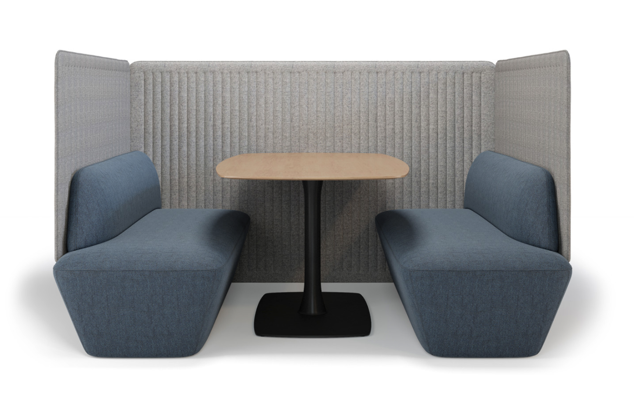 Distinctive upholstery details are used to create a 4 person booth with or without media.