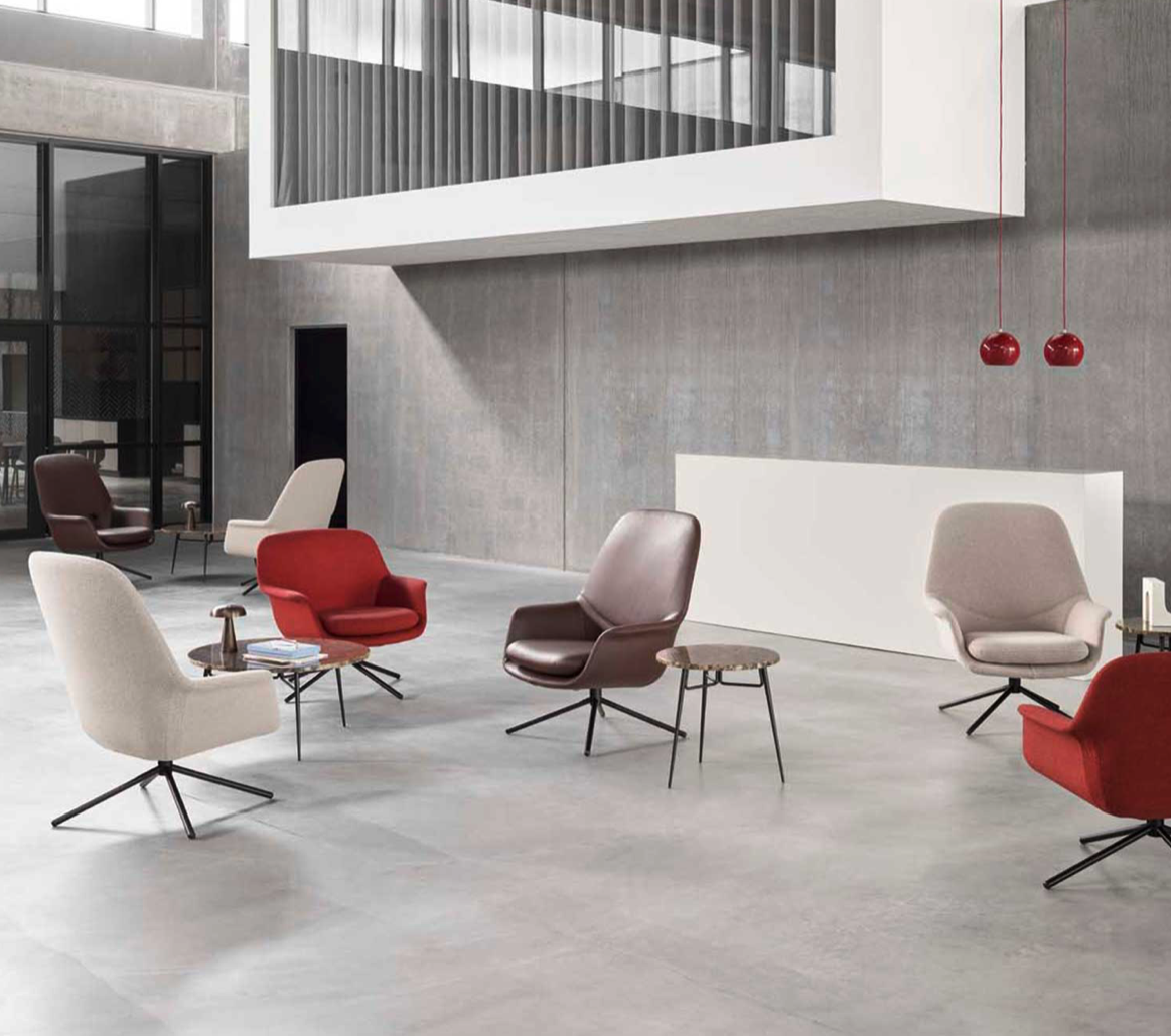 Smile Lounge, designed by Hee Welling, is a classic yet modern chair created to be practical yet elegant. Following an extensive study of lounge activities, the chair has been designed to support the postures of the modern work setting. Its upright structure provides comfortable support for the user during work activities. The chair is designed to find purpose within settings such as reception or meeting spaces, as well as areas for individual work and phone calls.
