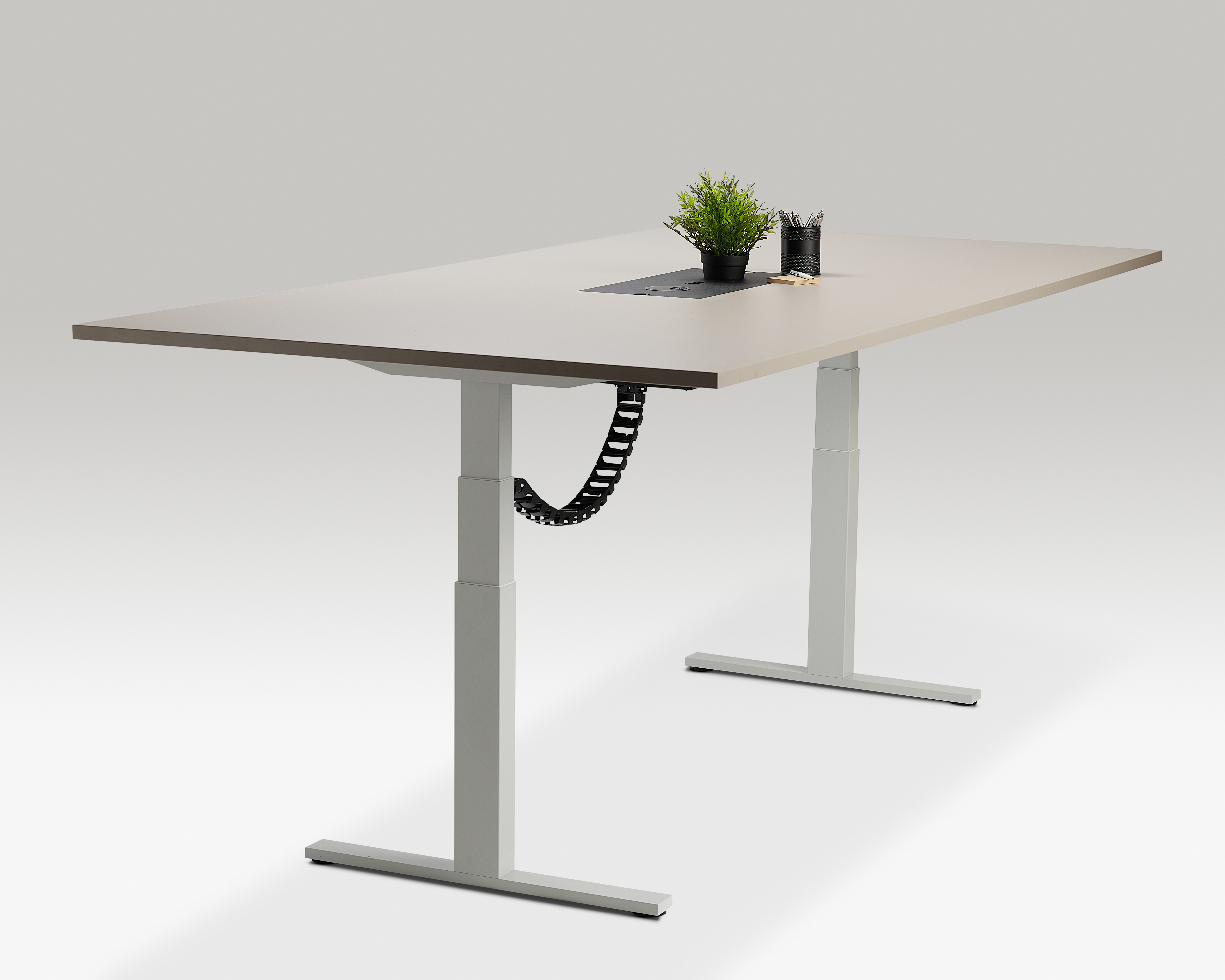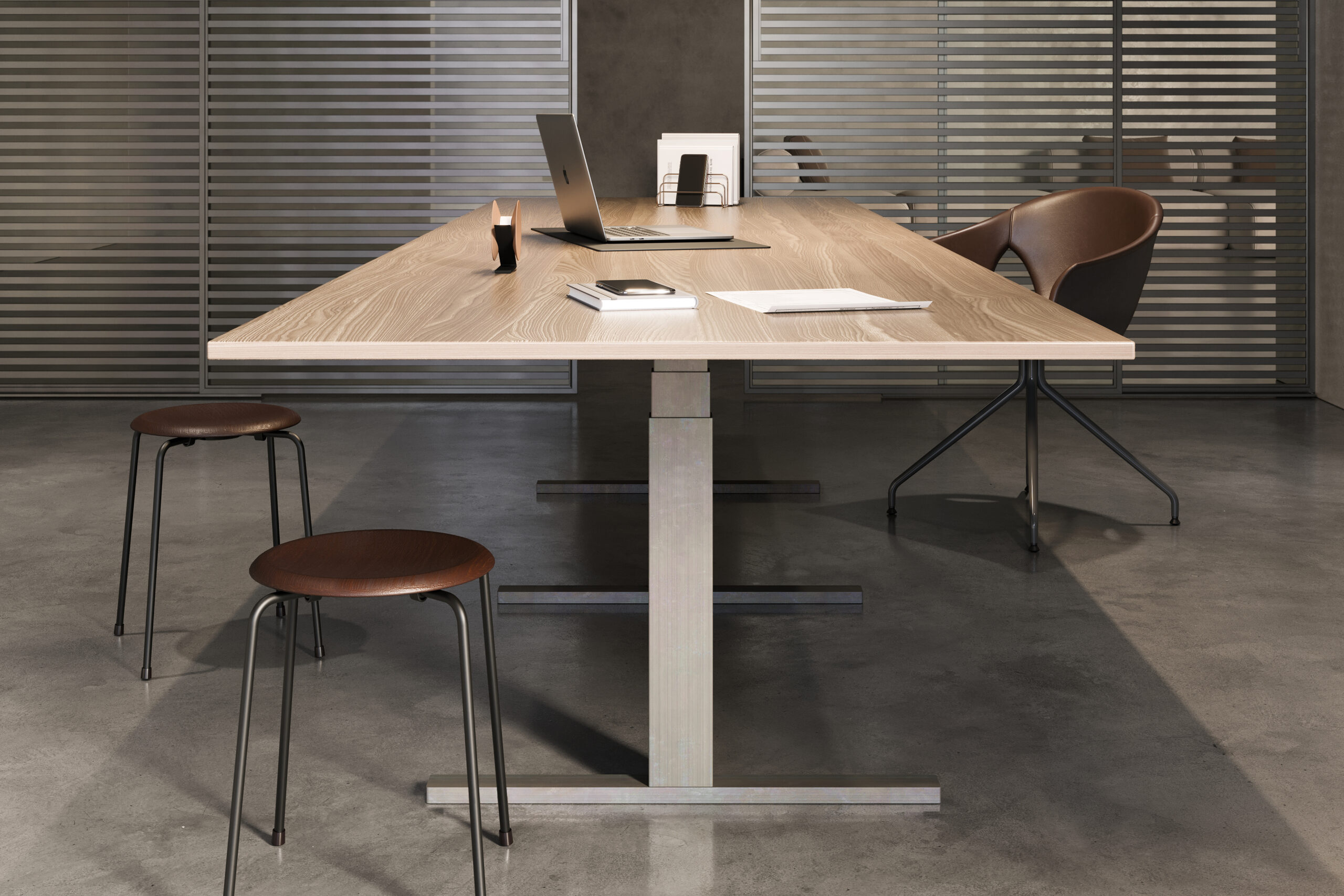Synergi Height Adjustable Collaboration Table The concept of stand-up meetings and working is not a new one. In fact, this is something that was advocated by both Winston Churchill and Ernest Hemmingway! Standing meetings are long proven to be more effective, yielding more creativity and ensure that meetings are kept timely and efficient. The height adjustable meeting table collection covers all team sizes, management styles, and applications.