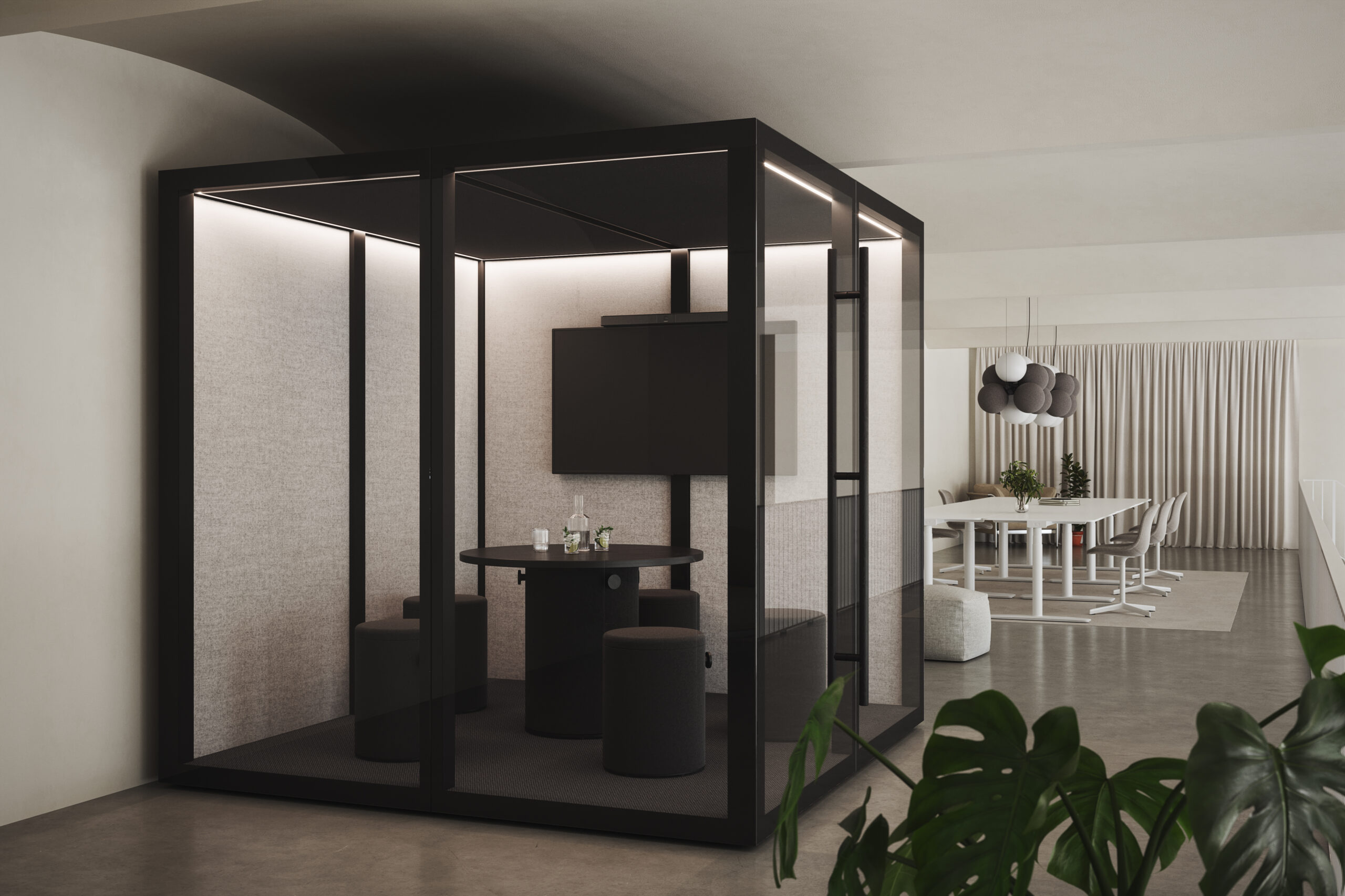 Available in 3 sizes. 2 versions. Black frame with black stained oak. Beige frame with natural oak. 60 Fabric colours for panels. Slatted outer panels. With or without furniture. With or without Video conferencing. small pod always has a fixed table